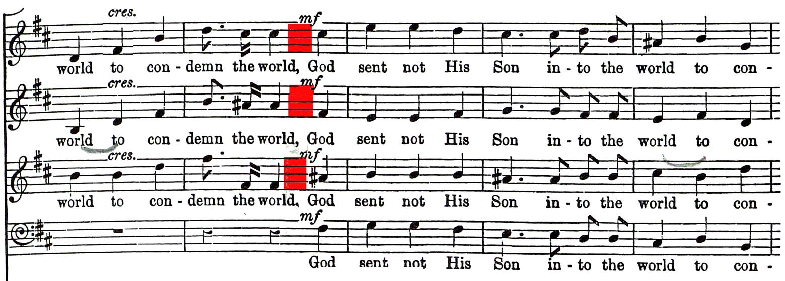 This is a simple example. But there are very many other examples in well-known anthems, such as in the ubiquitous ‘God so loved the world’. Page 2, ‘… to condemn the world, God sent…’ There’s no rest after ‘world’ but a breath has to be taken, therefore relax the tempo at that point, sing ‘world’ musically, take a breath, and then continue. When you’re conducting this, don’t indicate where the breath should be taken, for this will again lead to a moment of stress, but just lift your hands with a loose wrist on ‘world’ and breathe with your choir, showing that the tempo is relaxed, and then lower your hands to bring the choir in on the next word. When you’re going to relax the tempo, the conductor must also be relaxed.